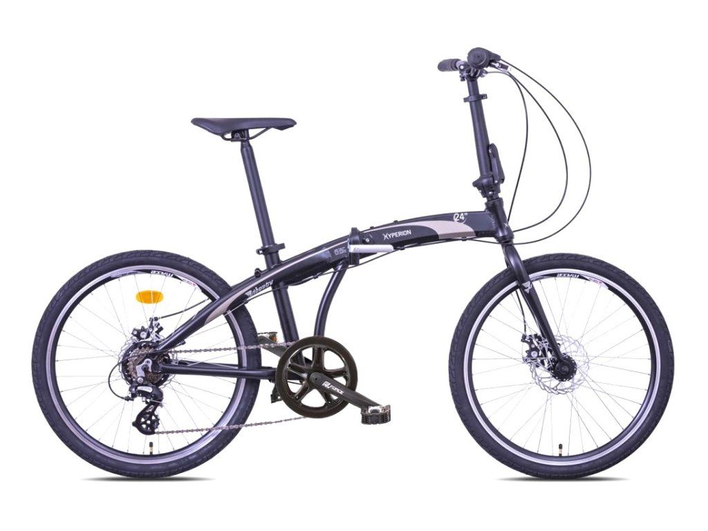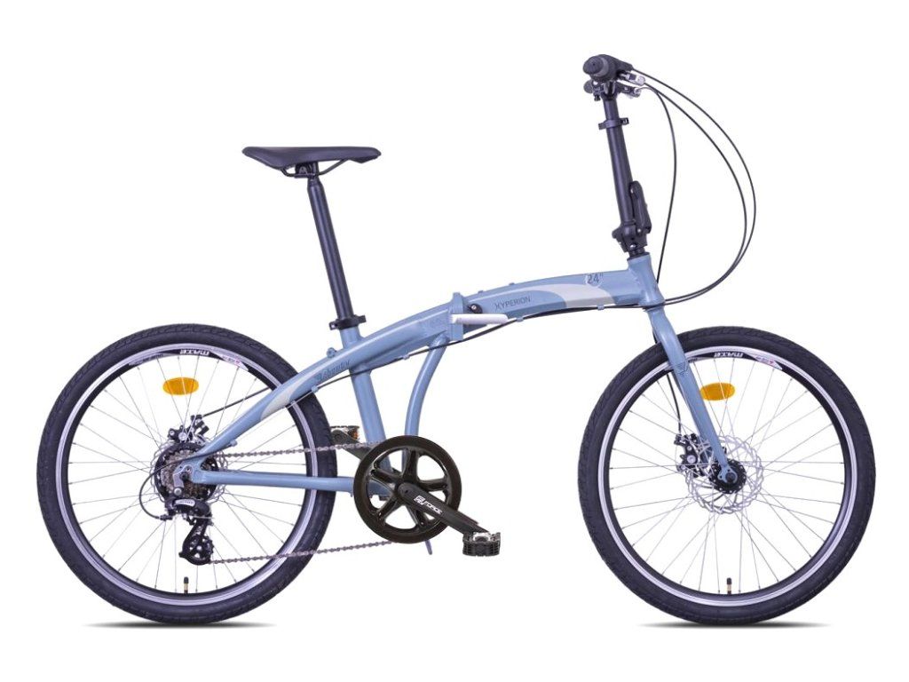 Najnovší model skladacieho bicykla na 24" kolesách, ktoré zabezpečia výrazne ľahšiu a komfortnejšiu jazdu po cestách vďaka lepšiemu odvaľovaniu kolies a nižšiemu valivému odporu. Bicykel má široké možnosti nastavenia posedu a riadenia, je tak vhodný aj na mierne športovejšiu jazdu pričom si zachováva praktické vlastnosti skladacích bicyklov. Po zložení je bicykel iba o málo väčší od klasickej 20" skladačky a je možné ho pohodlne naložiť do osobného auta či vlaku. Hyperion 24" je ideálny spoločník na výlety do vzdialených destinácií v kombinácii auto/vlak + bicykel. Vo výbave nechýbajú diskové brzdy ani skladacie pedále a predstavec.