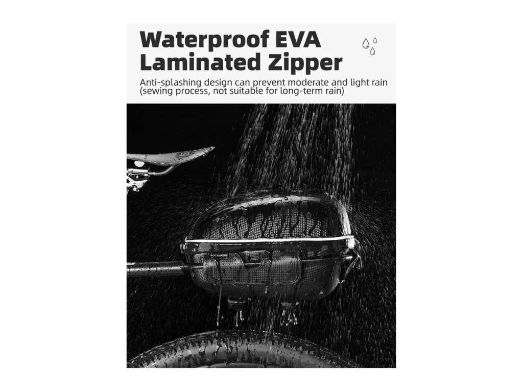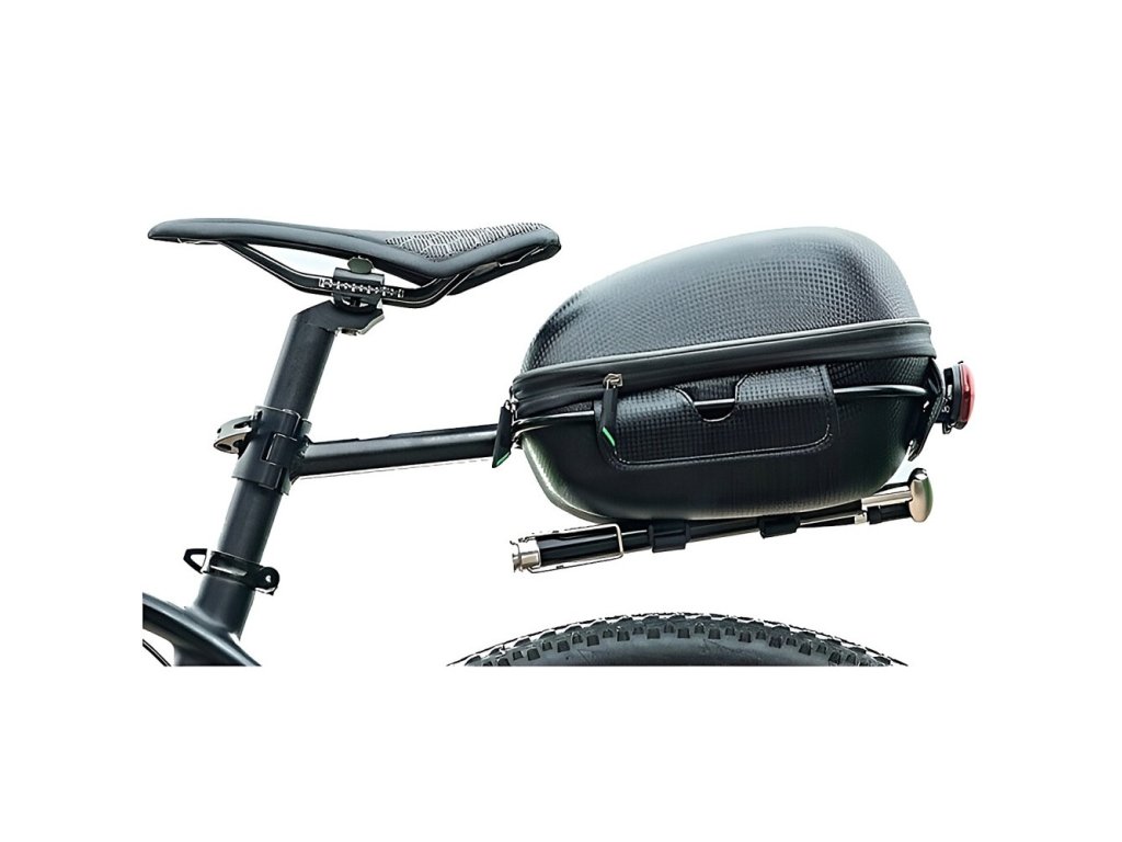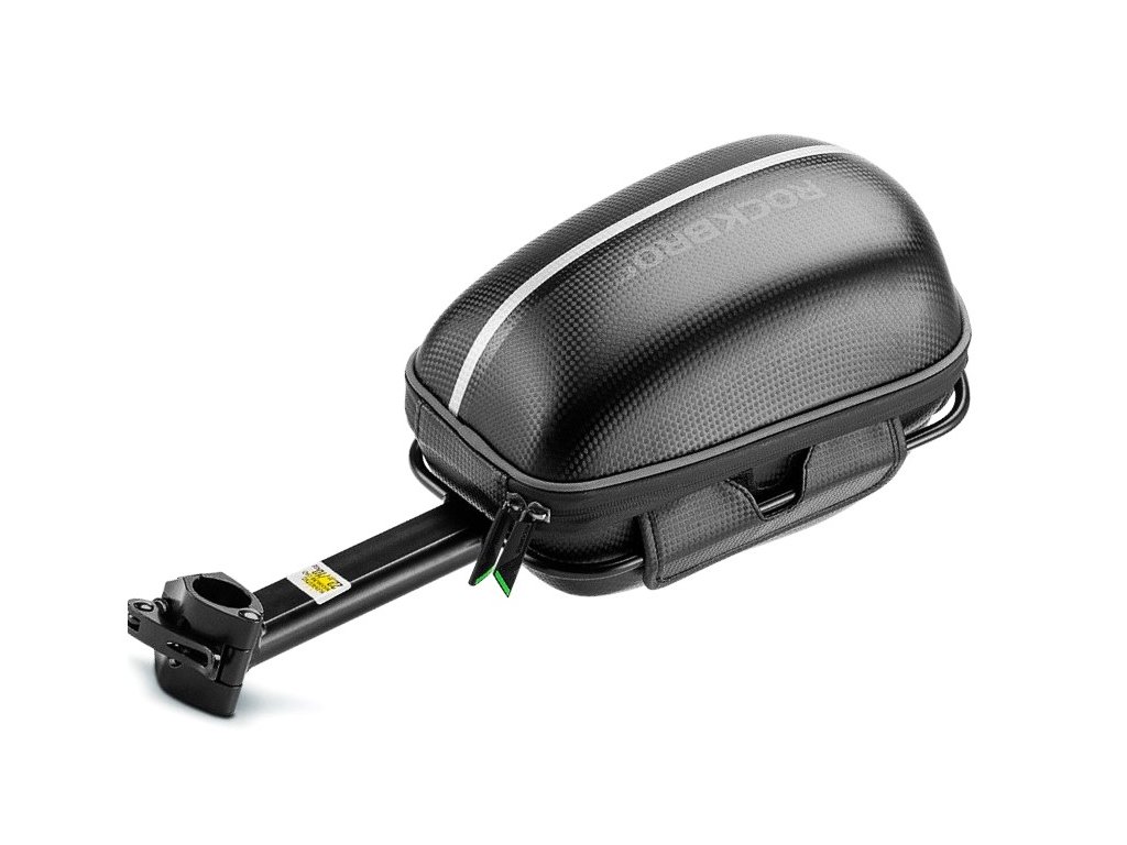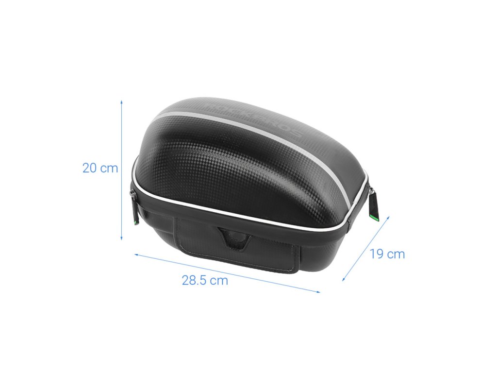 Nepremokavé, tvrdé škrupinové púzdro RockBros na bicykel s reflexným pásikom, vyrobená z : Polyuretan 60% + Nylon 5% + Polyester 35%. Nosný duralový nosič s rýchloupevňovacou svorkou, s montážou na sedlovku (je súčasťou balenia). Rozmer púzdra: 285 x 190 x 200 mm. Objem cca 9 litrov. Na zadnej strane má držiak na blikačku a spodnej miesto na upevnenia pumpičky. Súčasťou balenia je aj duralový nosič s rýchloupinákom. Taška zároveň slúži ako blatník. Hmotnosť bez nosiča 637g.