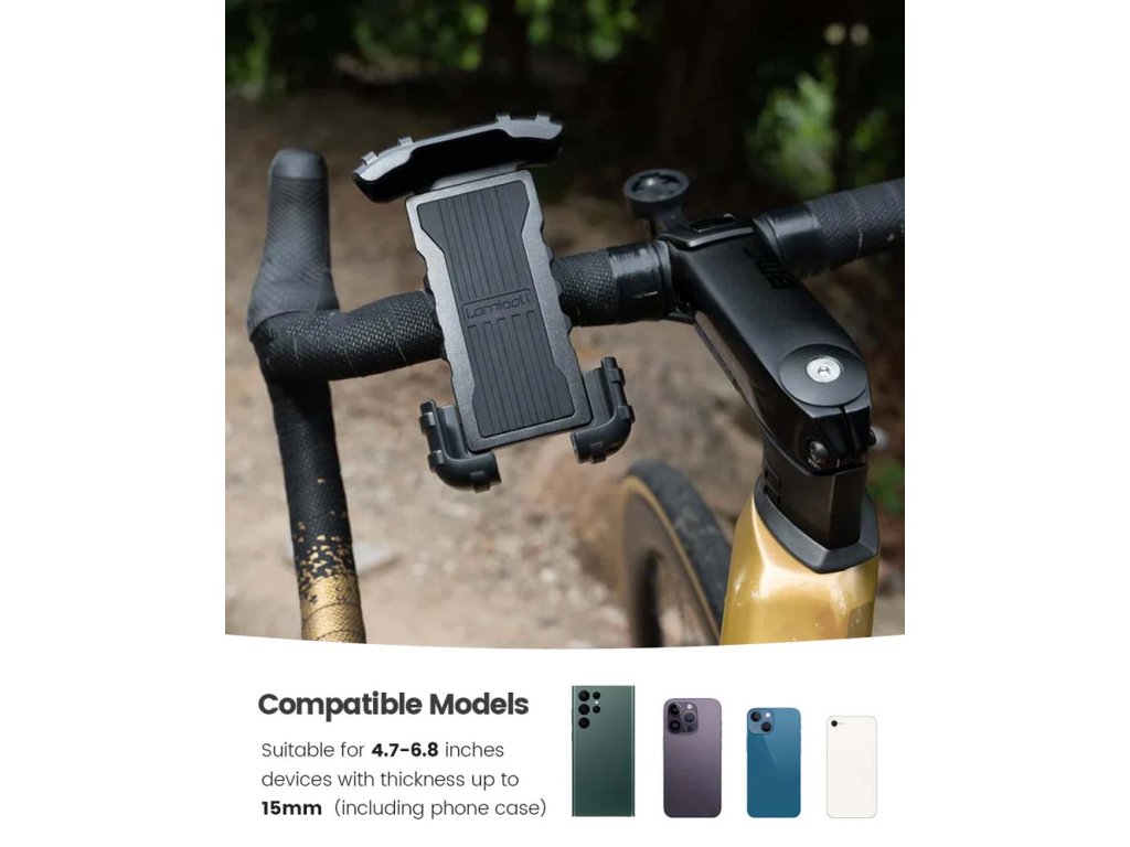 Tento držiak na telefón na bicykel je kompatibilný so všetkými telefónmi so šírkou 2,3 – 3,54 palca vrátane telefónov s uhlopriečkou 4,7 – 7 palcov. Maximálna hrúbka svorky na telefón je 0,59 palca.