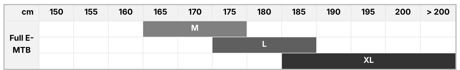 Upozornenie: Tabuľka odporúčaných veľkostí rámov pre Full E-MTB bicykle slúži iba ako orientačná pomôcka. Vzhľadom na individuálne rozdiely v postave každého jazdca nemusí vždy presne zodpovedať skutočnosti. Najlepší spôsob, ako si overiť správnu veľkosť rámu, je skúšobná jazda u autorizovaného predajcu.
