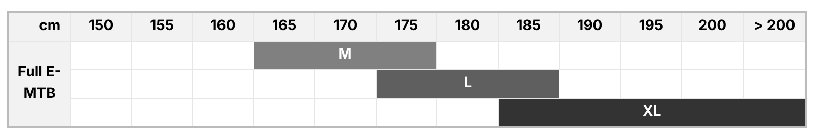Upozornenie: Tabuľka odporúčaných veľkostí rámov pre Full E-MTB bicykle slúži iba ako orientačná pomôcka. Vzhľadom na individuálne rozdiely v postave každého jazdca nemusí vždy presne zodpovedať skutočnosti. Najlepší spôsob, ako si overiť správnu veľkosť rámu, je skúšobná jazda u autorizovaného predajcu.
