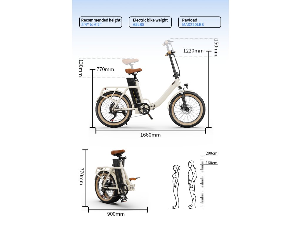 Skladací elektrický bicykel s rámom pre nízky nástup, ako pre ženy, tak aj pre mužov, v elegantnej matnej čiernej, alebo krémovej lesklej farbe s dlhým dojazdom.