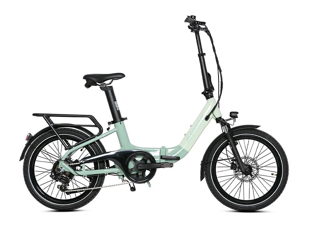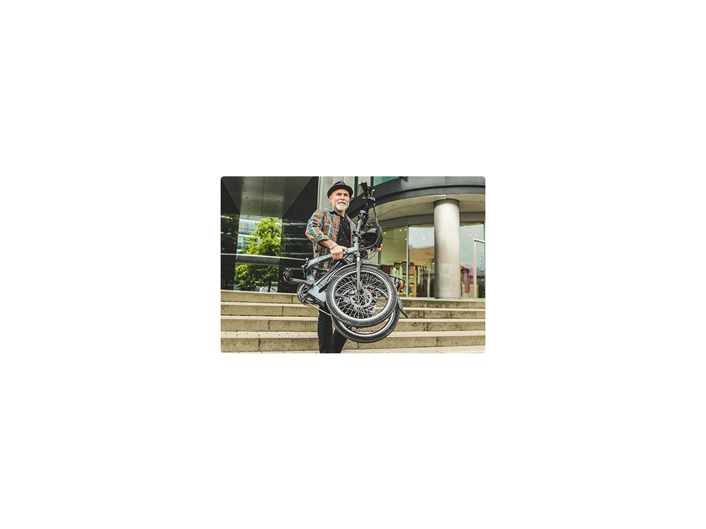 Skladací elektrický bicykel s rámom pre nízky nástup, ako pre ženy, tak aj pre mužov, s hydraulickými brzdami a torzným snímačom pre plynulú jazdu a rozjazd.