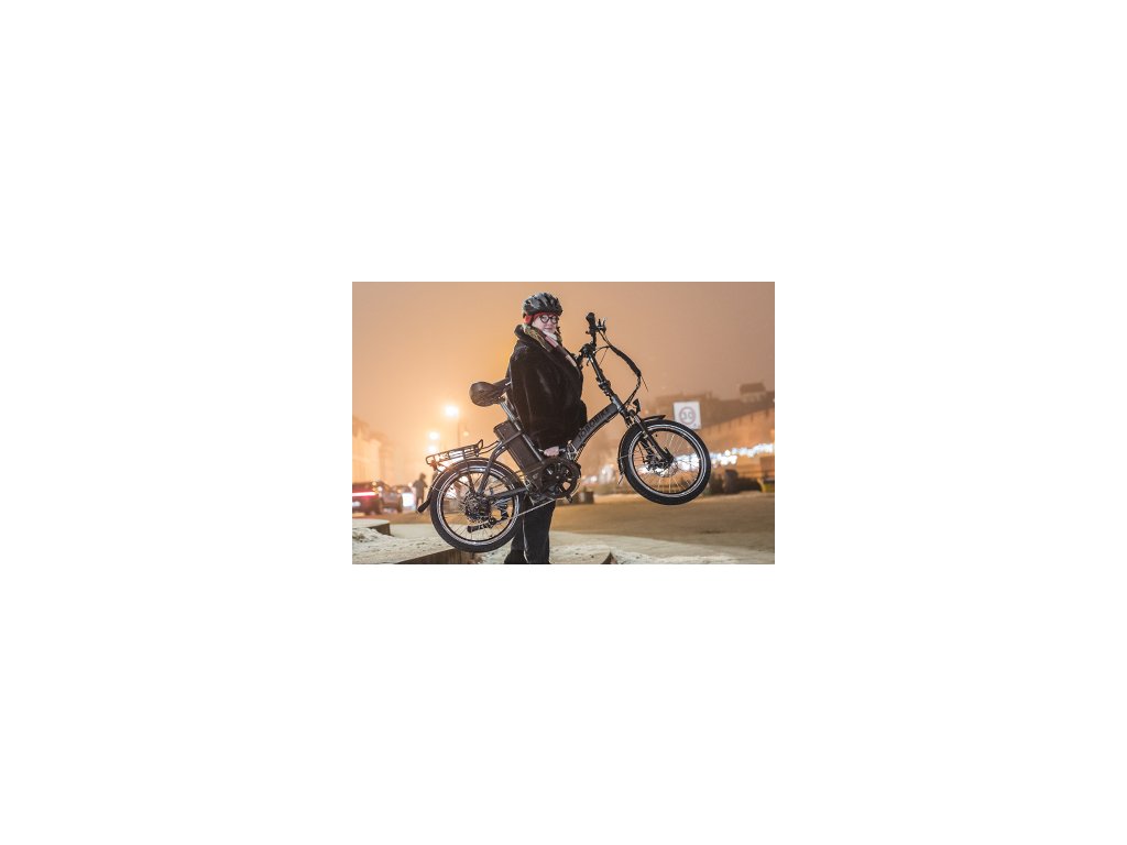 Skladací elektrický bicykel s rámom pre nízky nástup, ako pre ženy, tak aj pre mužov.