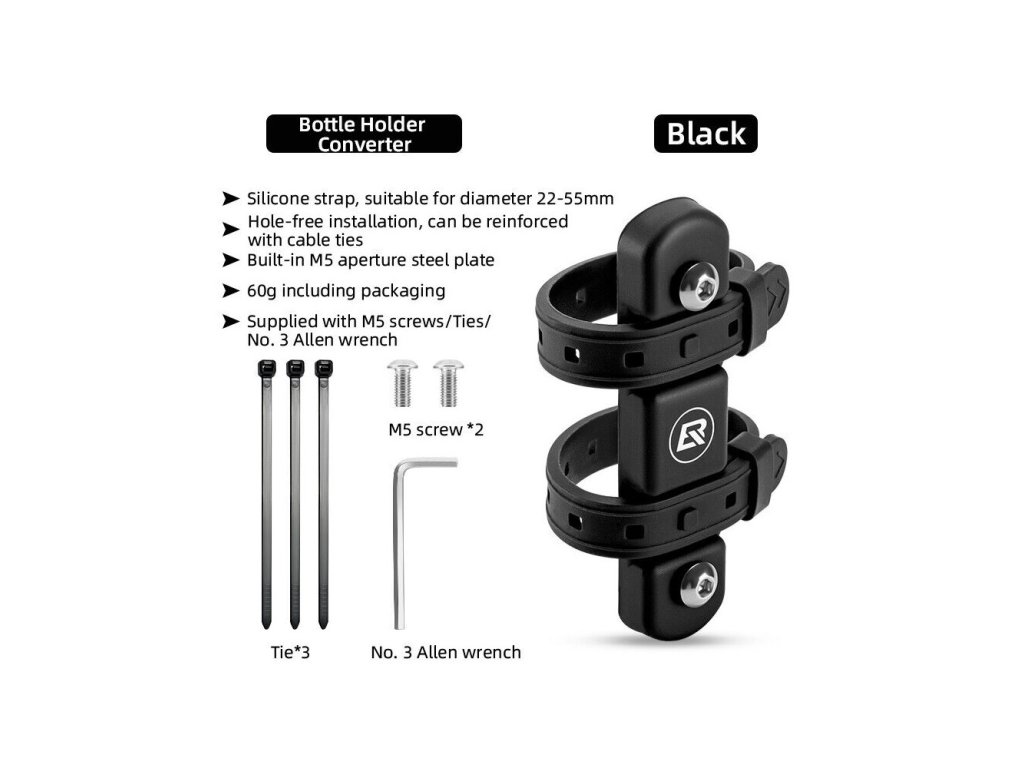 Upínacia svorka RockBros na upevnenie košíka na fľašu. Fľašu umiestnite kdekoľvek na ráme a na akýkoľvek rám bicykla, alebo sedlovku, alebo predstavec … . Nepotrebujete náradie. Pomocou dvoch silikónových pások fľašu umiestnite kdekoľvek na trubku priemeru 22 – 55mm. Pomocou prídavných sťahovacích pások môžete inštaláciu ešte spevniť. Materiál : v silikóne obalený oceľový plát čiernej farby.